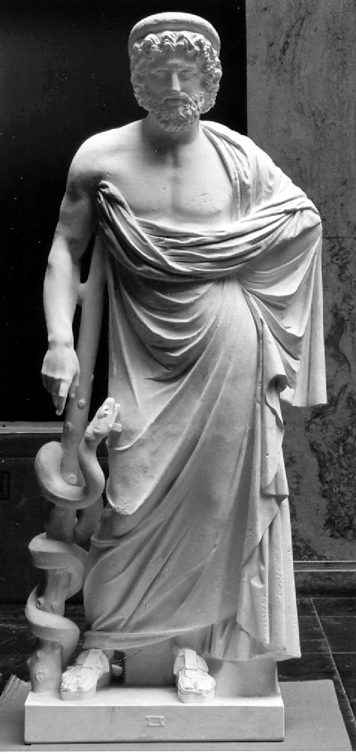 Asklepios war keiner der traditionellen griechischen Götter, sondern ursprüngich ein Heilheros in Thessalien/Nordgriechenland. Im Mythos spielte er überhaupt keine Rolle. Er war ausschließlich ein Gott des Kultes, an den sich die Menschen mit der Bitte um Heilung und der Danksagung für Genesung wandten. Über die Anfänge der Asklepiosverehrung wissen wir wenig. Seit dem 5. Jh. war Epidauros das Zentrum des Asklepioskultes. Von dort aus wurden seit dem späten 5. Jh. Filialheiligtümer gegründet, z.B. im Jahre 419/18 v.Chr. in Athen. Früher hatte man der Heilkraft der Heroen oder der Göttin Athena vertraut. Die rasch wachsende Popularität des „neuen“ Heilgottes erklärt sich wenigstens zum Teil aus der Verunsicherung, die durch die politische und ökonomische Krise um 400 v.Chr. (Peloponnesischer Krieg, Ende des ersten attischen Seebundes) hervorgerufen wurde. Während des 4. Jh. wandten sich die Menschen bevorzugt Gottheiten zu, von denen sie wirksamere Hilfe erwarteten als von den fernen Göttern ihrer Väter.