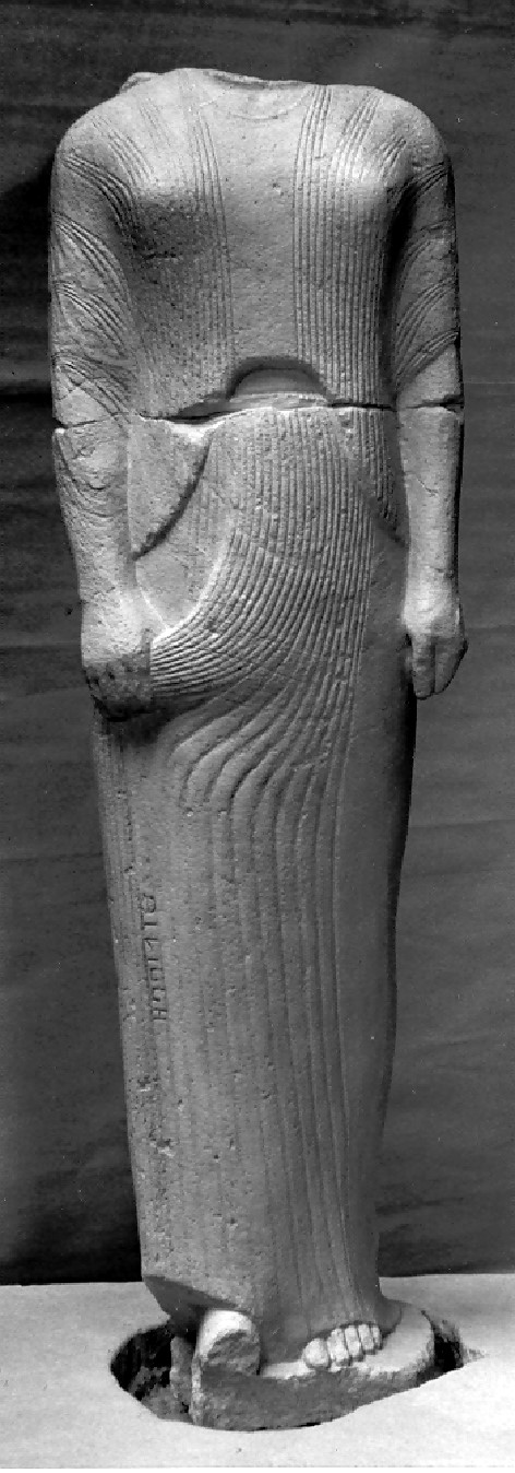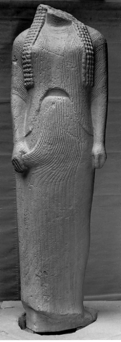 Über zwei Schichten von Porosplatten erhebt sich eine dreistufige Basis, in der die Plinthen der sechs Figuren eingelassen sind. Die sitzende Figur thront auf einem schweren kubischen Armsessel und setzt ihre Füße auf einen Schemel. Bekleidet ist sie mit einem Chiton und einem schweren, doppelt gelegten Manteltuch. Obwohl die Art der Kleidung an die männlicher Figuren, wie z.B. der Branchiden aus Didyma, erinnert (vgl. Abguß Inv. 483), erfahren wir durch die Inschrift auf der Vorderseite des linken Sesselbeins, daß mit der Statue eine Frau namens ΦΛΕΙΑ (Phileia) gemeint ist. Auf ihrem Mantelsaum hat der Künstler seine Signatur hinterlassen: ΗΜΑΣ ΕΠΟΙΗΣΕ ΓΕΝΕΛΕΩΣ (uns machte Geneleos).Die zweite erhaltene Figur stellt ein stehendes Mädchen dar. Bekleidet ist sie mit einem langen, gegürteten, eng am Körper anliegenden Chiton, der einzelne Körperformen durchscheinen läßt. Ihr linker Fuß schreitet leicht nach vorne aus, und die Rechte rafft das Gewand und zieht es graziös in einem Wulst zur Seite. In der Falte neben dem Wulst wird sie durch eine Inschrift als ΦΙΛΙΠΠΗ (Philippe) bezeichnet. Auf der Rückseite der Figur beeindruckt die reiche Fülle des in 27 Lockensträhnen gegliederten Perlhaares.