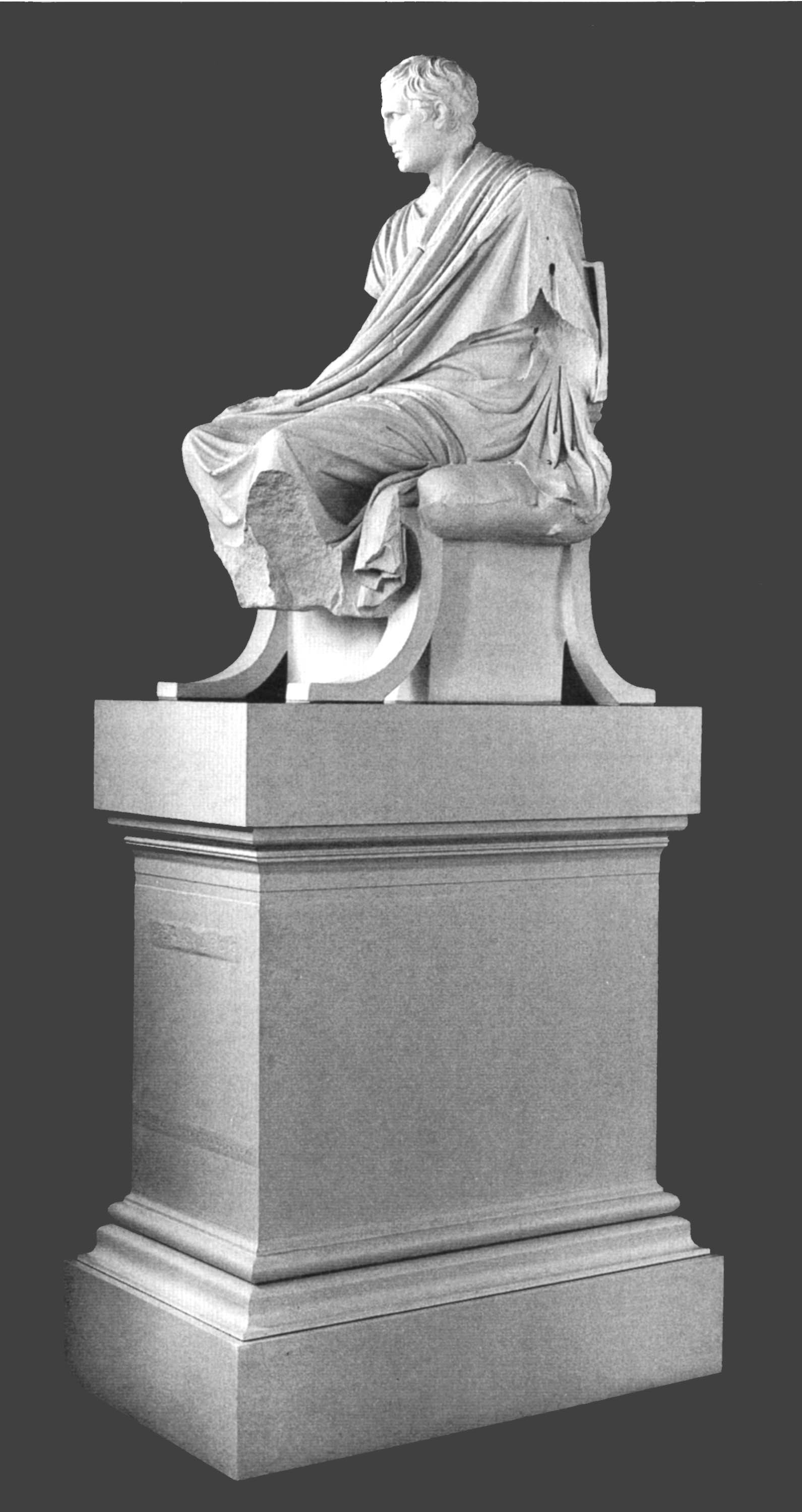 Nun musste die wiedererlangte Statue mit der Basis aus dem Athener Dionysostheater verbunden werden. Sie wurde in Göttingen mit einem hohen Basisblock (Plinthe), einem darauf aufgesetzten, separat gearbeiteten Profil (Kyma) und am oberen Abschluss mit einer fast ebenso hohen und breiten Deckplatte ergänzt (siehe Abb.).