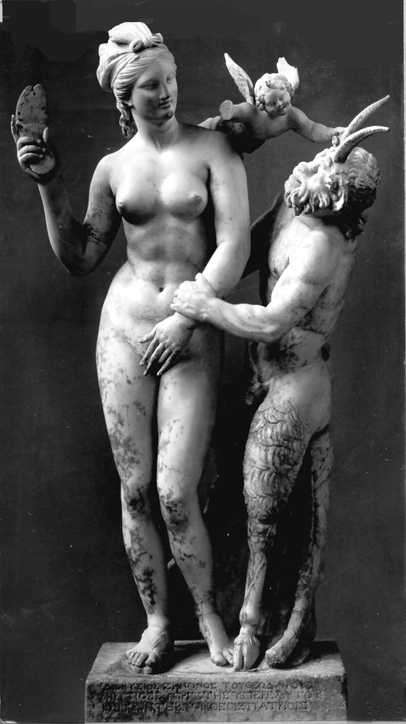 Noch ein Wort zur Benennung der Statue vom Esquilin: Seit ihrer Auffindung sind mehrere, mit Recht vergessene Vorschläge gemacht worden, und es scheint fraglich, ob die Taufe der Statue auf die berühmte Kleopatra VII., wie sie jüngst wiederholt wurde, die Identifizierung mit der Liebesgöttin ersetzen wird. Für Venus spricht neben der Nacktheit die Handlung des Umwindens des Haares mit einer Binde, welche die Gebärde der Aphrodite Anadyomene (der aus dem Meer aufsteigenden Göttin, die sich das nasse Haar ausdrückt) umwandelt. Auch die Sandalen, die unsere Venus trägt, dürfen bei der Benennung nicht unbeachtet bleiben. Dieses Schuhwerk spielt bei hellenistischen Aphrodite-Bildern eine Rolle, welche die Göttin beim Ausziehen einer Sandale zeigen, – ein altes, auf Vasenbildern bereits des 5. Jhs. v. Chr. in Hochzeitsszenen erscheinendes Motiv. Seine erotische Bedeutung führt die delische Gruppe, Aphrodite und Pan (s. Abb.), in derber Weise vor Augen: Die Liebesgöttin droht dem zudringlichen Pan mit ihrer Sandale einen kräftigen Schlag zu versetzen. Freilich sind die Sandalen unserer Venus nur noch Attribut und gänzlich sinnentleert.