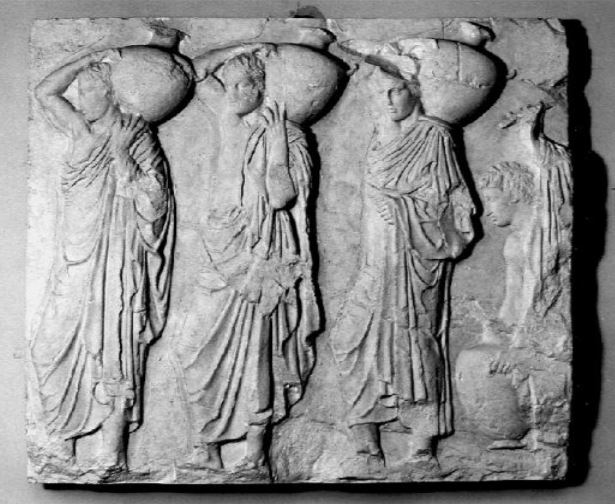 Der Parthenonfries befindet sich heute zum größten Teil im Britischen Museum in London; nur der Westfries verblieb am Parthenon auf der Athener Akropolis. Der etwa 160 m lange Fries umzog in ca. 14 m Höhe die Cella-Außenwand des Tempels. Die ursprünglich 50 cm dicken Friesblöcke wurden für den Transport nach England auf Plattenstärke zugerichtet. Bemalung und zahlreiche Bronzeappliken sollten zusammen mit der nach oben zunehmenden Reliefhöhe die Erkennbarkeit der maximal 1 m großen Figuren erleichtern.  Der Tempel war der Athena Parthenos geweiht. Seine Errichtung läßt sich mit Hilfe von Bauurkunden in die Jahre 447- 432 v. Chr. datieren. Der Skulpturenschmuck wird in der Folge: Metopen - Fries - Athenastatue (438 v. Chr.) - Giebel fertiggestellt worden sein.  Der Parthenonfries gibt in besonderer Auswahl und Gewichtung das große Panathenäenfest wieder, das 566/565 v. Chr. eingerichtet und seitdem alle vier Jahre im Sommermonat Hekatombaion gefeiert wurde; mit geringerem Aufwand fanden jährlich die kleinen Panathenäen statt. Die beiden ausgestellten Platten zeigen Szenen aus der Prozession, bei der ein gewebter Peplos an das Kultbild der Athena im alten Athena-Tempel (bzw. später im Erechtheion) übergeben wurde. Weitere Höhepunkte des Festes bildeten großartige Tieropfer, daran anschließende Bankette sowie athletische und musische Wettkämpfe. Platte Ost VII, Fig. 49-56:  Der rechte Rand ist modern gebrochen. Ost VII und Ost VIII bildeten ursprünglich eine Platte. Die Kopfzone fehlt, die modernen Abarbeitungen erfolgten bei einer 1818/20 vorgenommenen und jetzt entfernten Ergänzung. Ein zugehöriges Fragment mit dem rechten Fuß der Fig. 49 in Athen, Akropolismuseum.  Die Platte Ost VII zeigt links einen Mann, der einem heranschreitenden Frauenpaar gegenübersteht. Diese Dreiergruppe wird daneben ganz ähnlich wiederholt, rechts folgen zwei weitere Frauen. Die beiden Männer sind mit dem die rechte Schulter freilassenden Himation bekleidet; alle Frauen tragen den untergegürteten Peplos und einen den Rücken bedeckenden Mantel.  Der Mann links hält mit beiden Händen ein leider größtenteils weggebrochenes tellerartiges Gerät. An der preziösen Hand- und Fingerstellung ist erkennbar, daß es nicht allzu schwer ist; vier - am Original sichtbare - Bohrlöcher dienten der Befestigung bronzener Henkel oder Binden. Wahrscheinlich handelt es sich um das Kanoun, einen Behälter für die Opfergerste und das darunter verborgene Opfermesser. Die Gerste wurde zur rituellen Reinigung über die Opfertiere und in das Feuer auf dem Altar gestreut. Der Mann, den man am treffendsten als priesterlichen Beamten bezeichnen wird, übergibt das Kanoun an die beiden Kanephoren (= Trägerinnen des Kanoun). Das Ehrenamt der Kanephorie war sehr prestigeträchtig und durfte nur von den Parthenoi (= Jungfrauen) aus den besten Familien ausgeübt werden (vgl. Thuk. 6,56,1).  Auch der andere Mann hielt, wie das Stiftloch an der rechten Hand zeigt, ein bronzenes Attribut. Vielleicht war es ein Stab, wie er oft von Festordnern getragen wird (vgl. Pi. West XII Fig. 23). Mit dem ausgestreckten Zeigefinger der linken Hand dirigiert der Festordner die heranschreitenden Parthenoi und formiert sie zu Paaren (vgl. Thuk. 1,20,2 u. 6,57,1: Die Söhne des Peisistratos ordnen den Panathenäenzug). Offensichtlich wird hier die Spitze der Prozession gebildet, die sich auf die im Zentrum des Ostfrieses befindliche olympische Götterversammlung und die attischen Phylenheroen zubewegt. Nur die beiden ersten Paare gehen im Gleichschritt voran und zeigen die dem würdigen Ernst des feierlichen Ereignisses angepaßte Haltung, während die folgenden Parthenoi eine lockere und bisweilen sogar unruhige Reihe von Teilnehmern einleiten (vgl. die linke Seite des Ostfrieses: Pl. Ost 111).  Platte Nord VI, Fig. 16-19/20:  Die Platte ist bis auf einige Bestoßungen vollständig erhalten.  Die Platte Nord VI wird von der Prozessionsspitze (PI. Ost VII) durch wenige Platten getrennt, die weitere Parthenoi mit verschiedenen Opfergeräten und vor allem Tierführer mit Opferrindern und -schafen zeigen.  Drei Männer haben jeweils eine Kalpis geschultert. Sie sind alle mit dem die rechte Schulter freilassenden Himation bekleidet und setzen im Gleichschritt den rechten Fuß voran. Der vierte Träger bückt sich, um die Kalpis vom Boden aufzunehmen. Er wird fast vollständig verdeckt von einem langgewandeten Flötenspieler, der sich zum großen Teil auf der anschließenden Platte befand.  Kalpiden sind, genau wie Hydrien, für den Transport von Wasser übliche Gefäße. Wie schon die Opfergerste diente das Wasser der Reinigung: Vor der Opferhandlung mußten die Hände gewaschen werden. Die Prozession des Frieses - von den Kanephoren über die Opfertiere bis hin zu den Wasserträgern und Flötenspielern - weist somit ausführlich auf die bevorstehende Opferhandlung hin.  Beide Platten zeigen das für den gesamten Fries typische Bestreben, eine gleichförmige Reihung zu vermeiden. Gegen die Zugrichtung stehende, innehaltende sowie in die Tiefe gestaffelte Figuren, die oft in sehr flachem Relief gegeben sind, verleihen dem Bewegungsstrom ein rhythmisches Auf und Ab (Festordner Ostfries - PI. Ost VII 56, PI. Nord VI 19 - Frauenpaare Ostfries, PI. Nord VI 19). Auch auf den ersten Blick ähnliche Figuren variieren sowohl in der Körperhaltung als auch in der Gewanddrapierung (PI. Nord VI 16-18).  Kompositionelle und handwerkliche Unterschiede im Fries lassen deutlich die Arbeit verschiedener Werkstätten erkennen. Diese wurden von einer demokratischen Baukommission ausgewählt und eingeteilt. Daß die künstlerische Leitung allein bei Phidias, und entsprechend die politische Verantwortung für das Bauprogramm bei Perikles gelegen habe, wie Plutarch berichtet (Perikles - Vita 13.), ist mit den zeitgenössischen Quellen nicht vereinbar. Lediglich der Zeitstil ist „phidiasisch“.  Perikles kann wohl als Initiator oder F